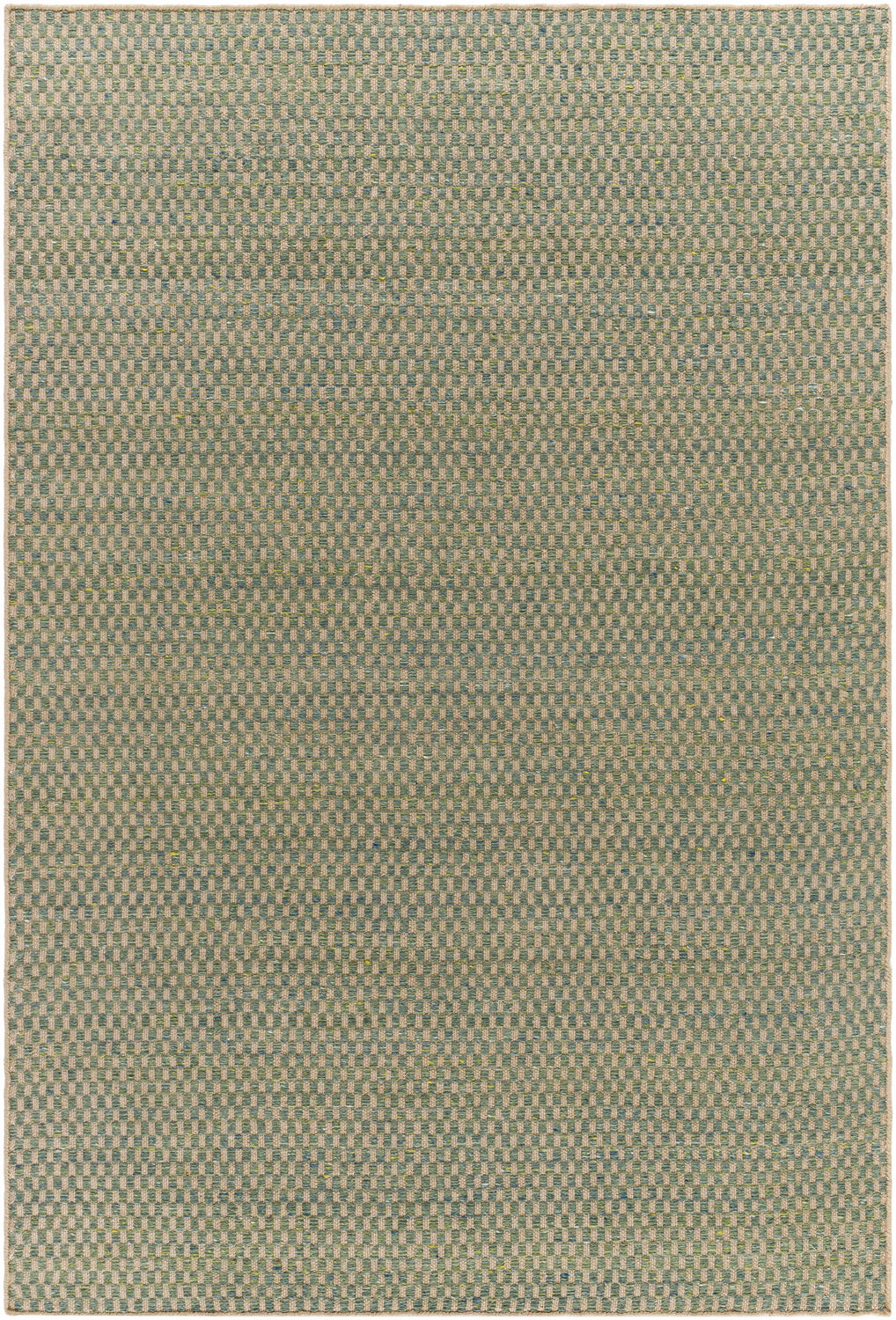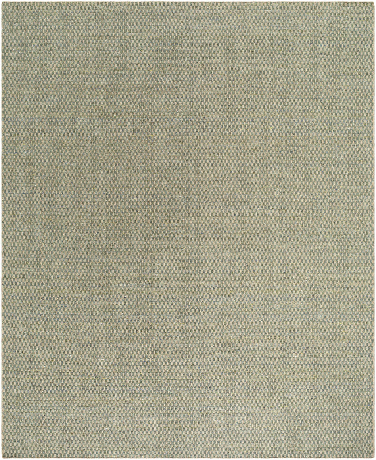 A rectangular flatweave area rug with a near-solid, subtly textured surface in muted sage green as the dominant color, interwoven with warm beige, tan, and faint brown threads throughout. The weave creates a fine, organic texture visible up close — like a tightly woven basket — giving the surface gentle visual depth without any distinct pattern or motif. The color distribution is even across the entire rug with no border, medallion, or directional design. Edges appear cleanly bound with no fringe or tassels. The overall impression is calm, natural, and understated — a grounded, earthy green that reads almost neutral in most lighting conditions.