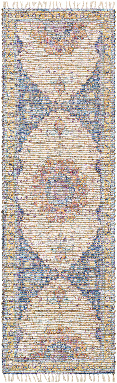 The Wallburg Hand Woven Colorful Tassel Rug Collection showcases traditional inspired designs that exemplify timeless styles of elegance, comfort, and sophistication. The meticulously woven construction of these pieces boasts durability and will provide natural charm into your decor space. Made with Jute, Polyester, Cotton in India, and has No Pile.