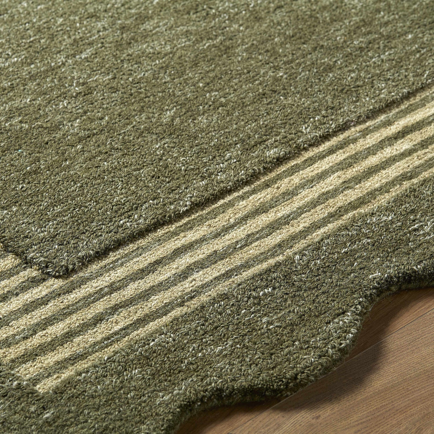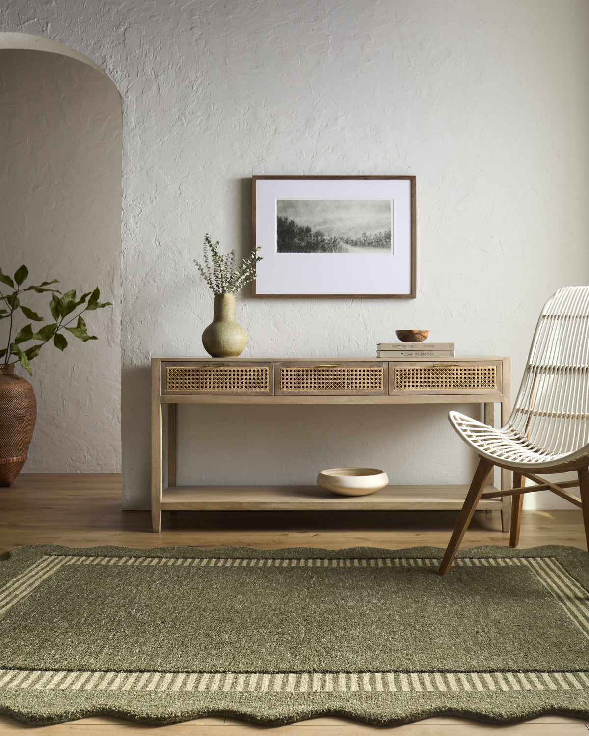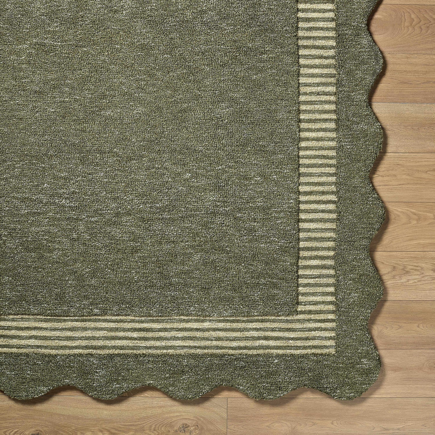 Rich olive green wool, a charming scalloped border, and handmade texture — the Wone rug brings quiet, nature-inspired warmth to any room.