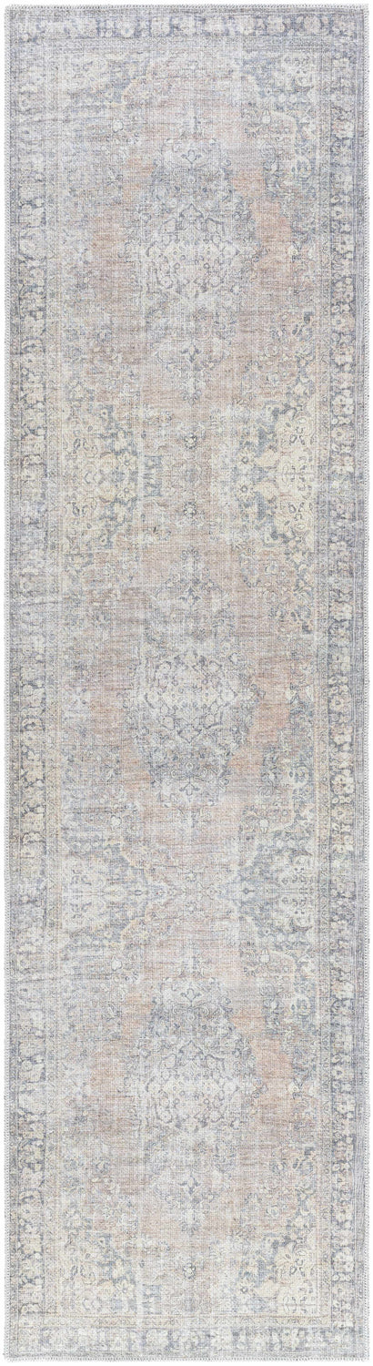 Introducing the Yachi Washable Area Rug, a unique collaboration between Becki Owens x Livabliss, radiating an updated traditional style that seamlessly blends into any decor. Its classic medallion design is reminiscent of vintage one-of-a-kind pieces, adding a timeless charm to your space. Constructed from durable polyester in Turkey, this rug can withstand high traffic areas with ease, ensuring it stays beautiful for years to come. The cool palette dominated by slate blue and grey beautifully complements the faded orange and off-white accents, creating an intriguing visual appeal. This machine woven rug features no pile which makes it easy to maintain and clean. For best results, we recommend using it with a rug pad and washing on a cold delicate cycle when needed. Add the Yachi Washable Area Rug to your home for an instant touch of elegance and comfort.