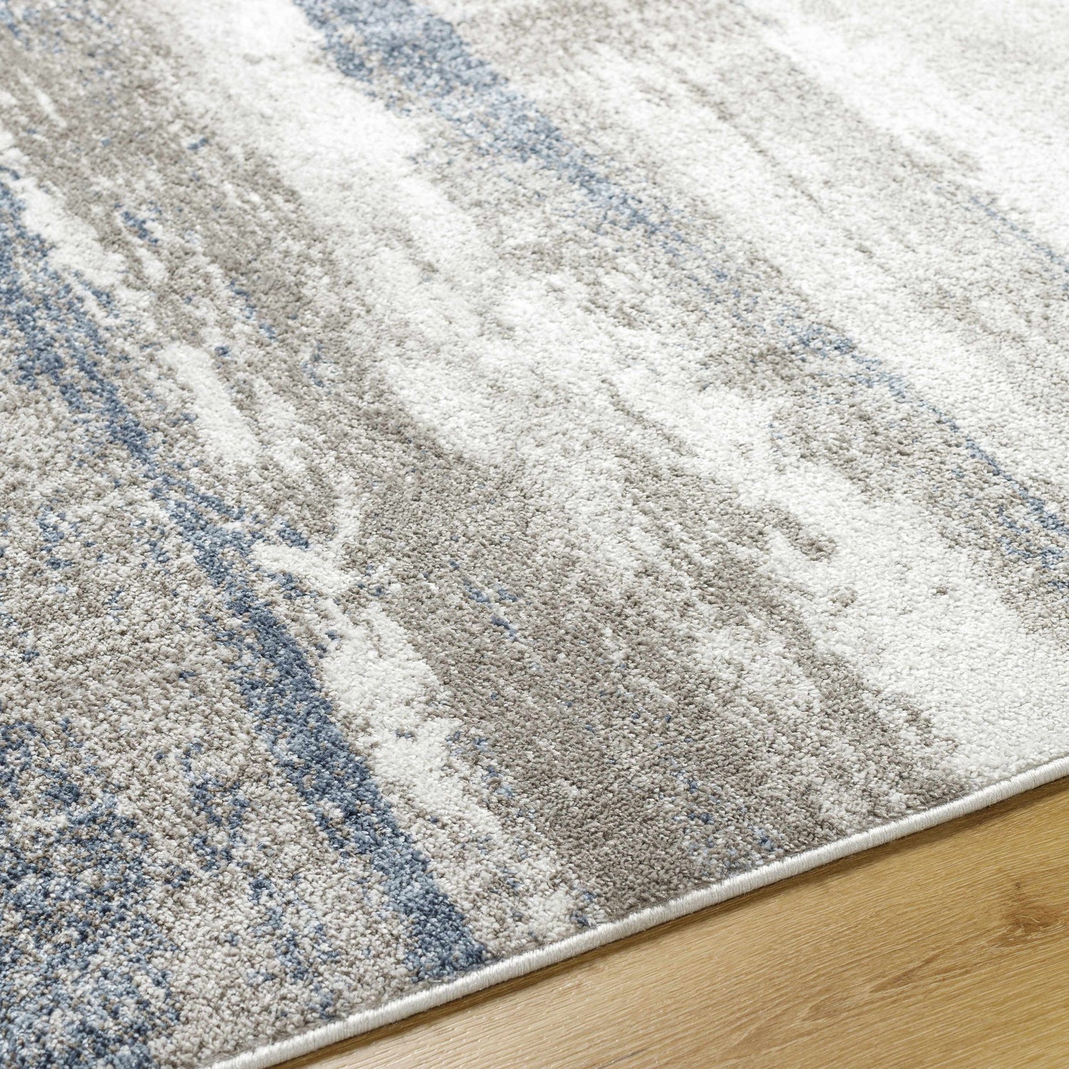 Cool gray and blue abstract brushstrokes give the Yuina a painterly, modern look — stain resistant polypropylene that handles everyday life without sacrificing style.